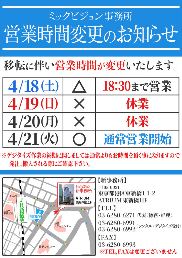 移転に伴い、4/18(土)〜4/20(月)の営業時間が変更となります。